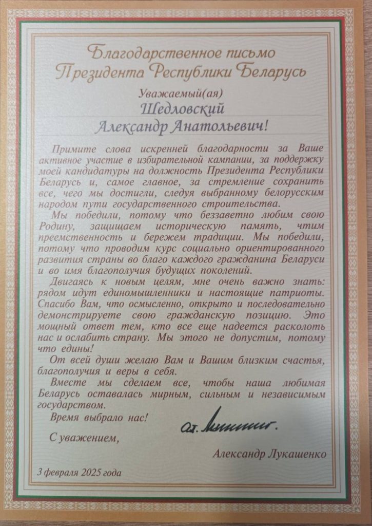 21.02.202521.02.2025г. Шедловскому Александру Анатольевичу, директору Гомельского комбината противопожарных работ – была вручена «Благодарность» Президента Республики Беларусь за активное участие в избирательной кампании по выборам Президента Республики Беларусь.