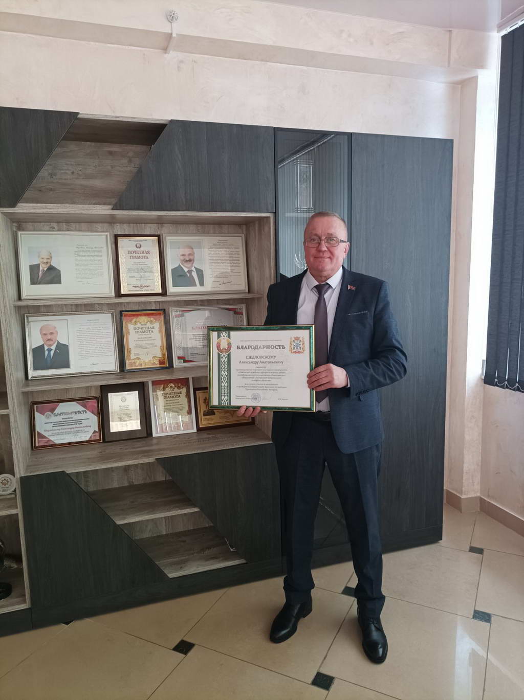 19.02.2025г. Председатель Гомельского облисполкома Крупко И.И. вручил  Шедловскому Александру Анатольевичу, директору Гомельского комбината противопожарных работ – «Благодарность» за активное участие в организации и проведении избирательной кампании по выборам Президента Республики Беларусь.